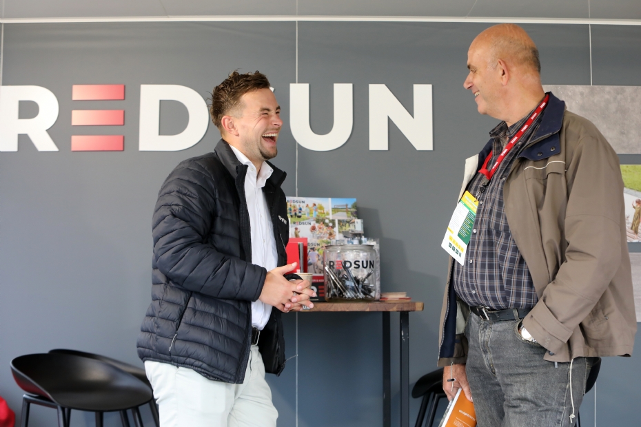 | Pret bij Redsun. Redsun zette de dag volledig in op de promotie van Cerasun, een tegel met een vaste verbinding van keramiek en beton. De tegels combineren een slijtvaste keramische toplaag met een sterk verdichte betonkern. |