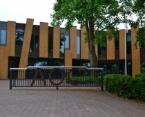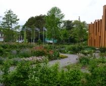 Complete buitenterrein inrichting van VMBO en MBO college AOC te Twello. Assortimentstuin, Uniek Gebouw, Leerlingen betrokken bij project, beeldbepalend in omgeving.