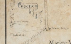 | | Op deze oude kaart staan drie boompjes ingetekend op de heuvel. |