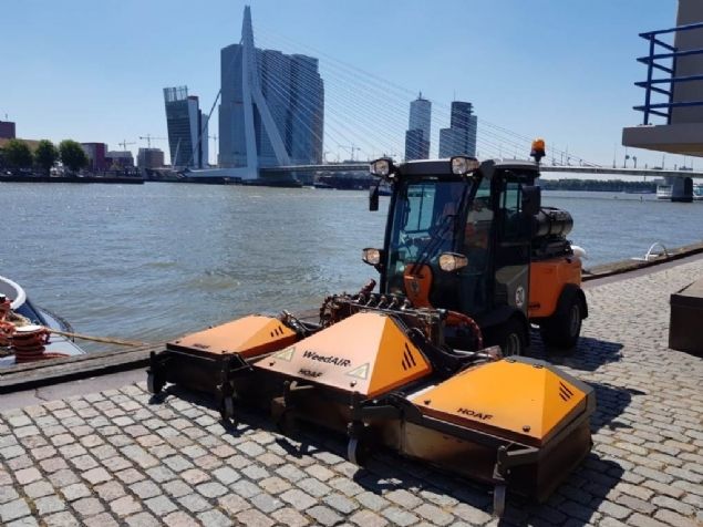 In Rotterdam rijdt een extra brede Hoaf Weedair rond in de strijd tegen onkruid. De machine wordt door Den Boer Groenprojecten ingezet en speciaal op maat gemaakt.